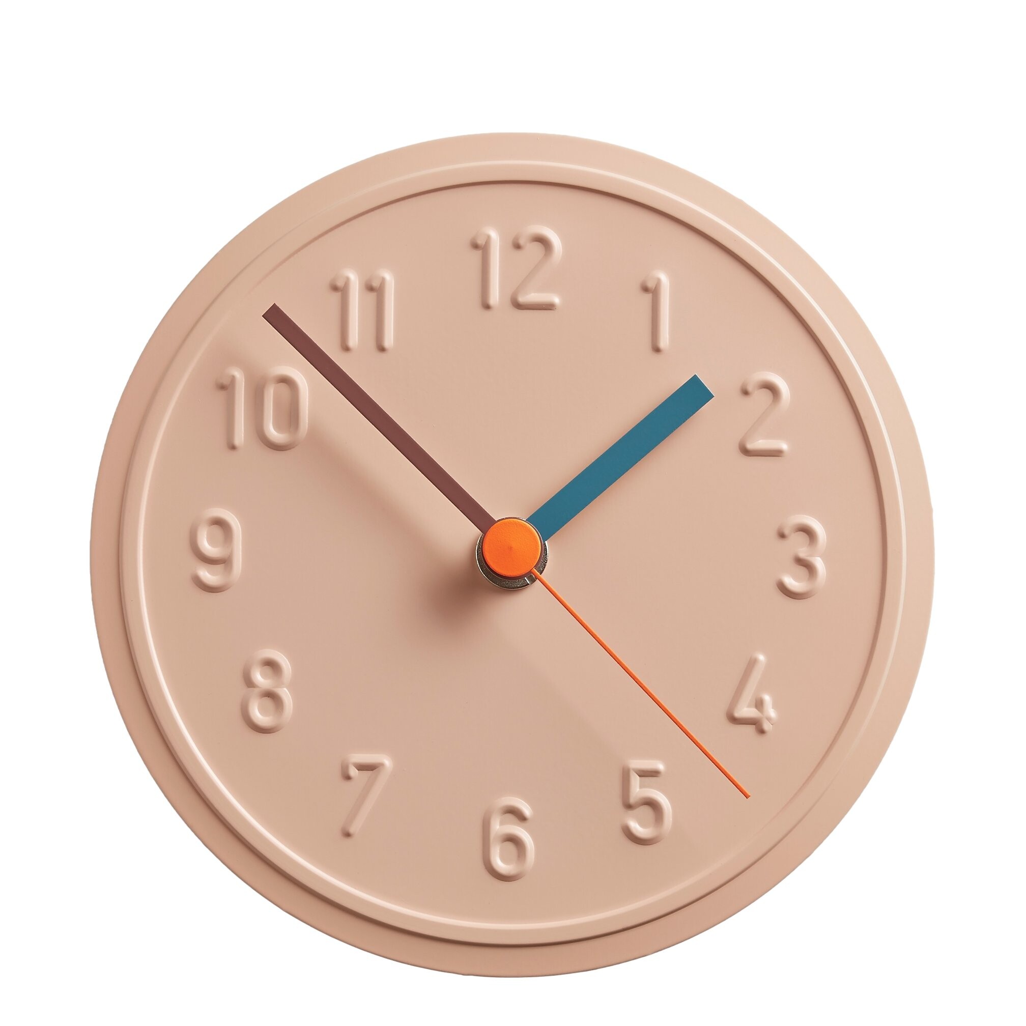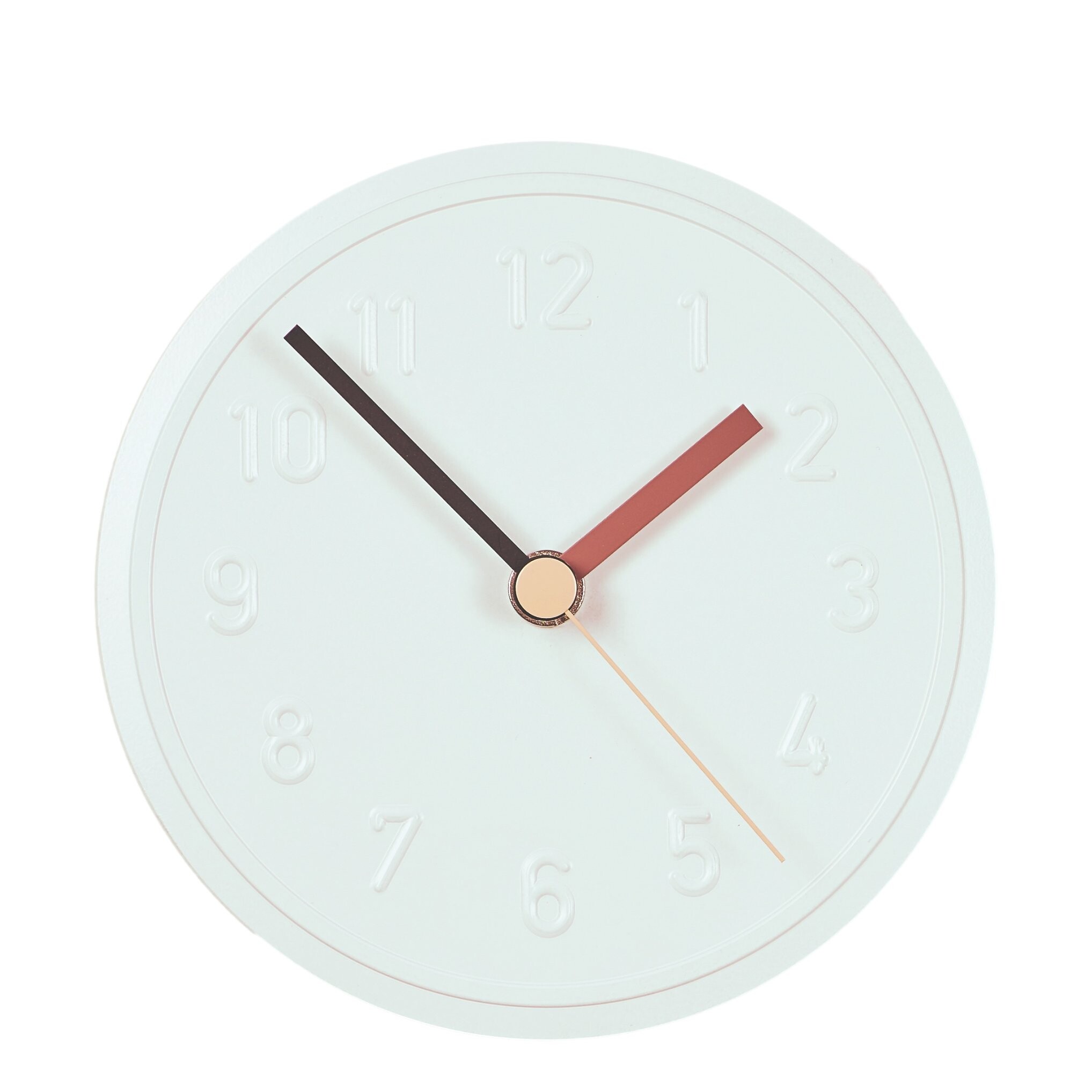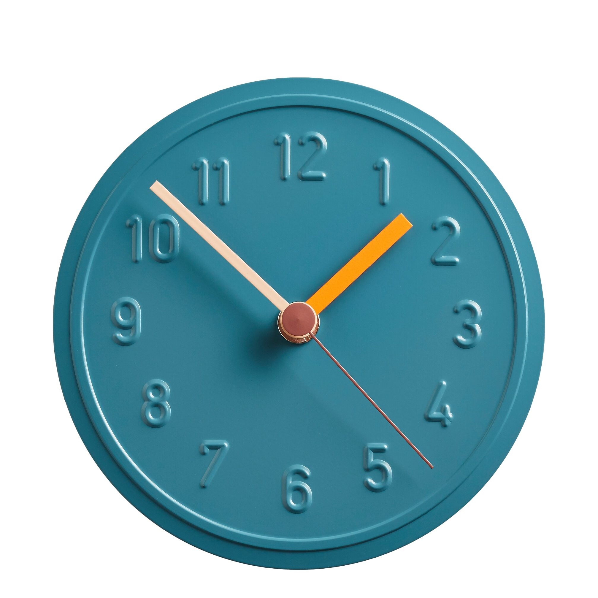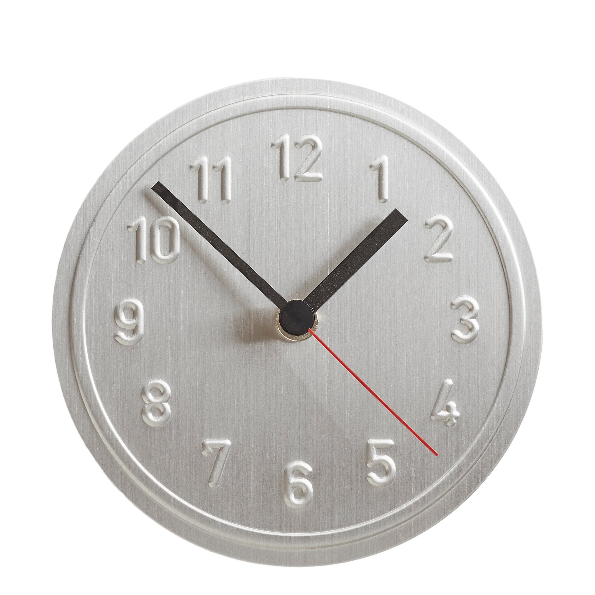 Reduziert auf das Wesentliche: Quarzuhrwerk, Uhrzeiger und das wie ein Autonummernschild in dickes Aluminium geprägte, unifarbene Zifferblatt. Sie zeigt sich entweder in Aluminium, weiß, schwarz oder in vier Farben, die Alexander Seifried 2012 entwickelte. Herausgekommen sind tolle Farbvarianten, die sich komplementär im Zifferblatt und den Uhrzeigern wiederfinden.