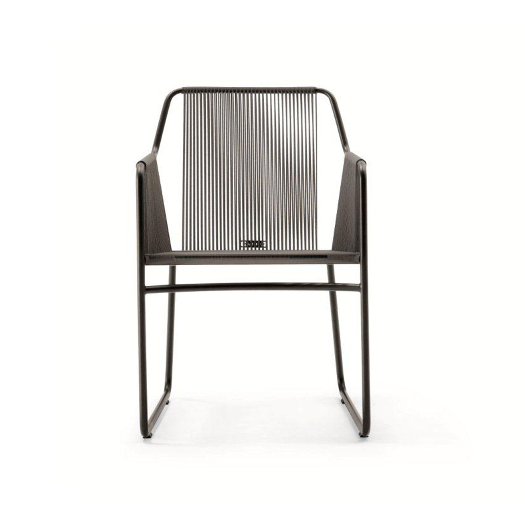 Der HARP Armlehnstuhl ist aus lackiertem Edelstahl gefertigt, der für den Außenbereich geeignet ist, und wird von Hand bearbeitet und geschweißt, um höchste Qualität und Langlebigkeit zu garantieren. Die handgefertigte Verseilung besteht aus Polyester- oder Acrylfäden mit einer Endbearbeitung aus Baumwolle, was dem Stuhl eine besondere Eleganz verleiht.