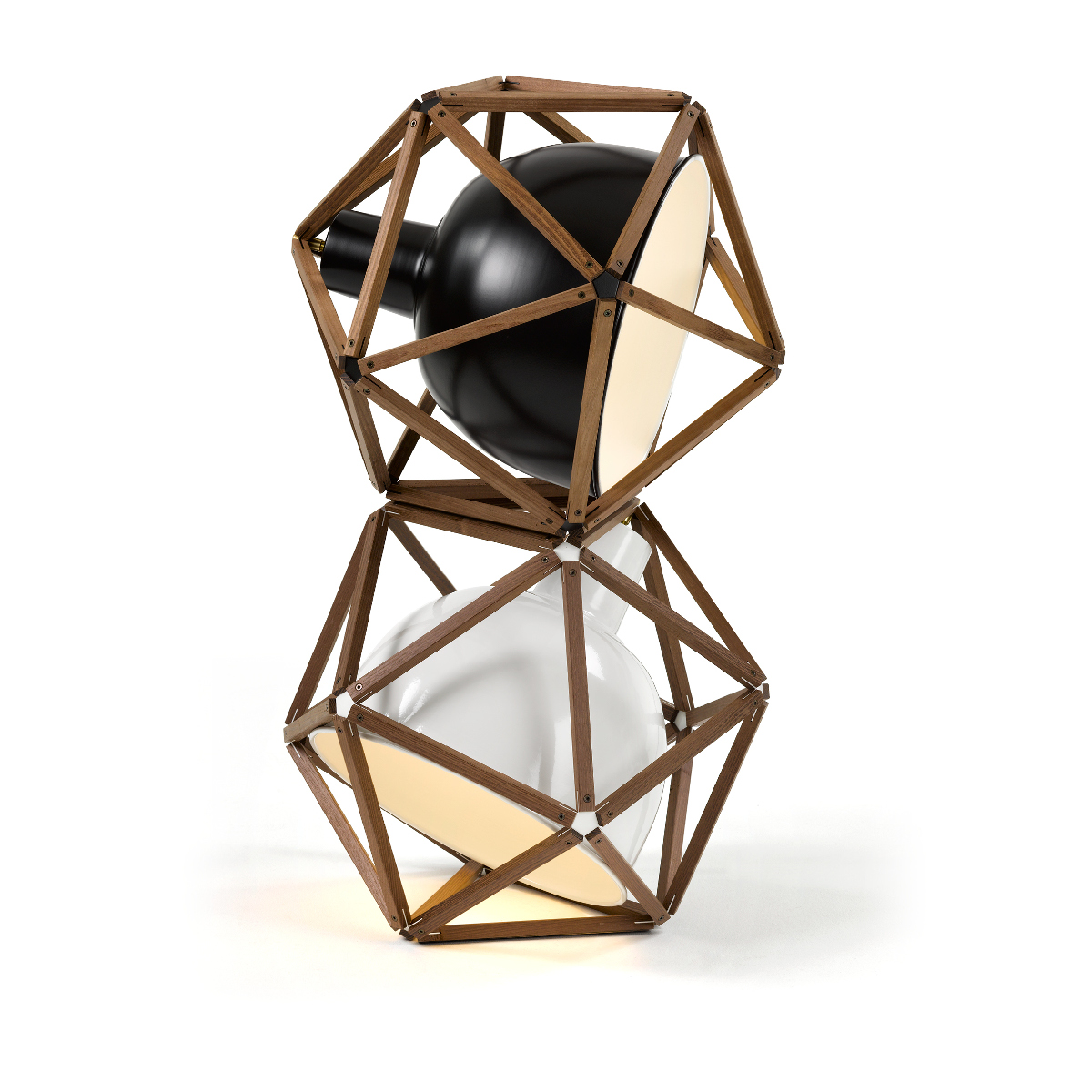 Der klassische Industrielampenschirm wird bei der Block 2 Leuchte von dreißig Massivholzstäben in gedämpfter Akazie umschlossen und erhält so einen geometrischen Rahmen, der vielseitiges Positionieren ermöglicht.