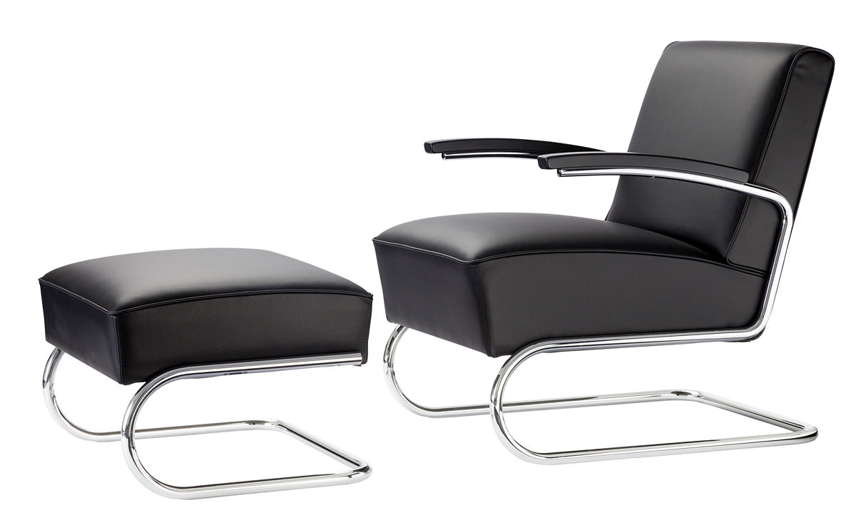 Während die ersten Stühle aus Stahlrohr aus den 1920er Jahren kaum mit Polstern versehen waren, so taucht im Thonet-Katalog von 1935 bereits eine ganze Serie voluminös gepolsterter Sessel und Sofas auf. Vermutlich markiert der Thonet-eigene Entwurf von S 411 aus dem Jahr 1932 den Beginn dieser neuen Produktreihe. Heute wird er mit einer hochwertigen Federkern-Polsterung gefertigt. Dazu gibt es einen passenden Fußhocker.