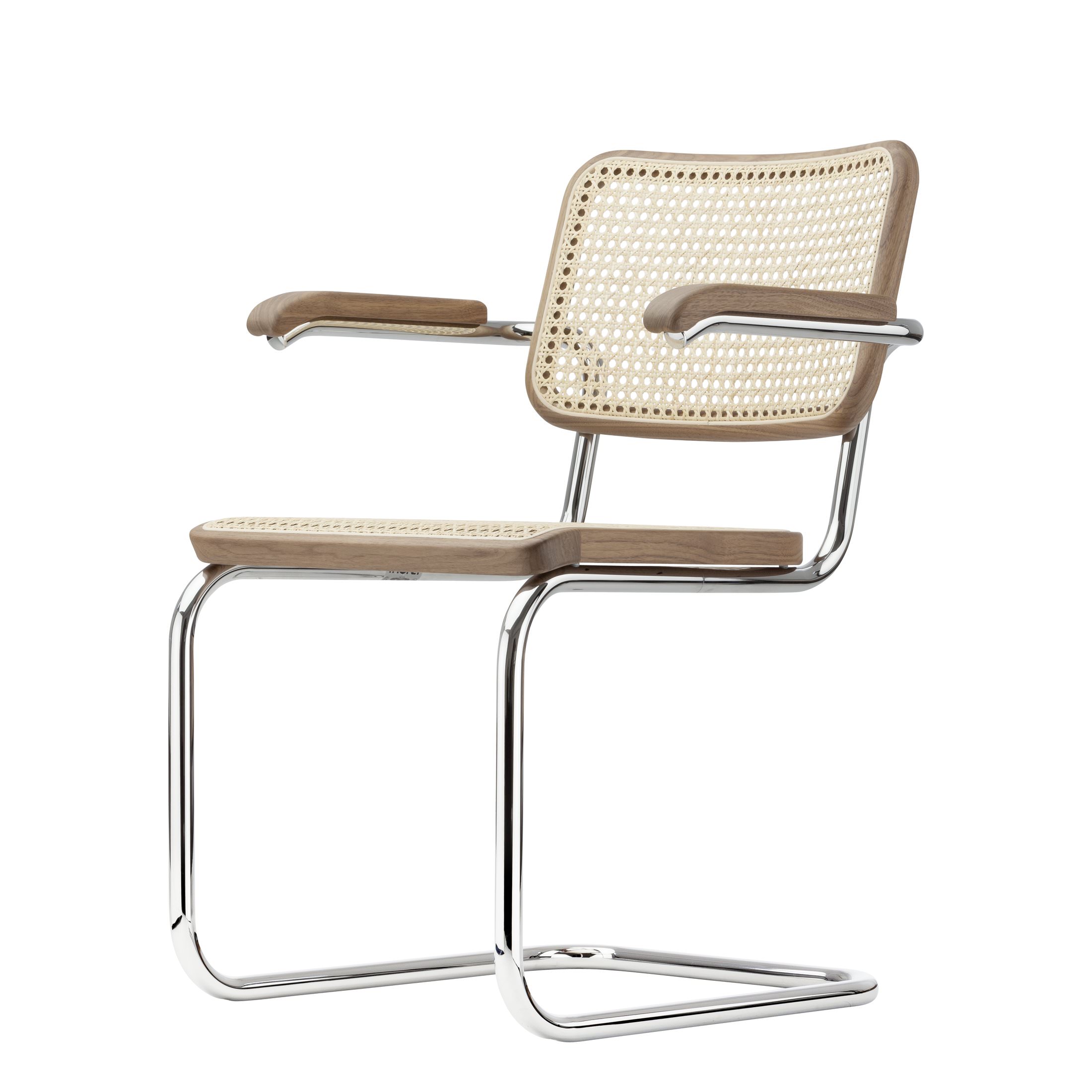 Der Armlehnstuhl S 64 ist für jegliche Verwendung geeignet, ob für Konferenzen, Wartezonen, Restaurants oder in der eigenen Wohnung. Sein Merkmal ist die ausgereifte konstruktive Form des Stahlrohrs in Verbindung mit Holz und Rohrgeflecht.