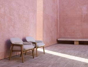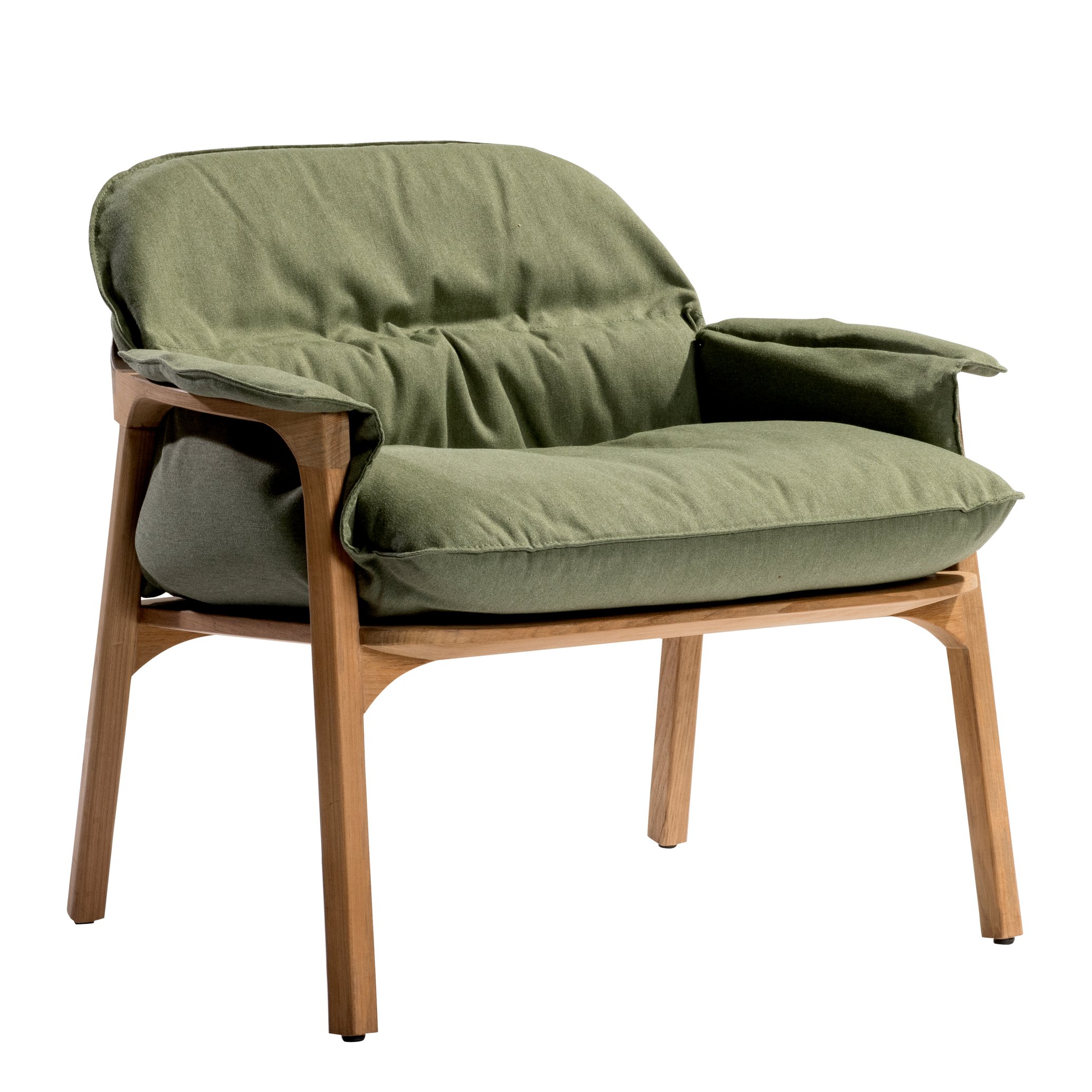 Das komfortable Sitzpolster des Nomad ist in verschiedenen Stoffen und Farben erhältlich. Das Untergestell besteht aus edlem Teakholz, das Wärme und Langlebigkeit ausstrahlt.