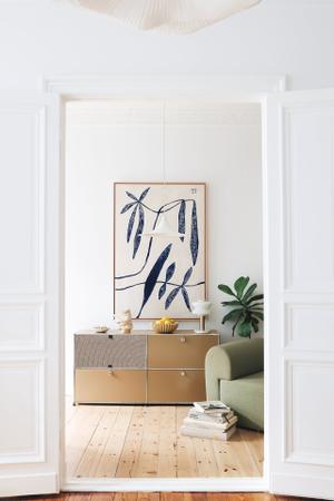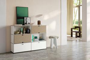 Das modulare Möbelbausystem USM Haller steht seit über 40 Jahren für maßgeschneiderte Lösungen. Aus wenigen Elementen entstehen Möbel für den Wohnbereich, komplette Arbeitsplätze für zu Hause und funktionale Bürolandschaften. In diesem Fall eine Kommode mit drei Klapptüren.