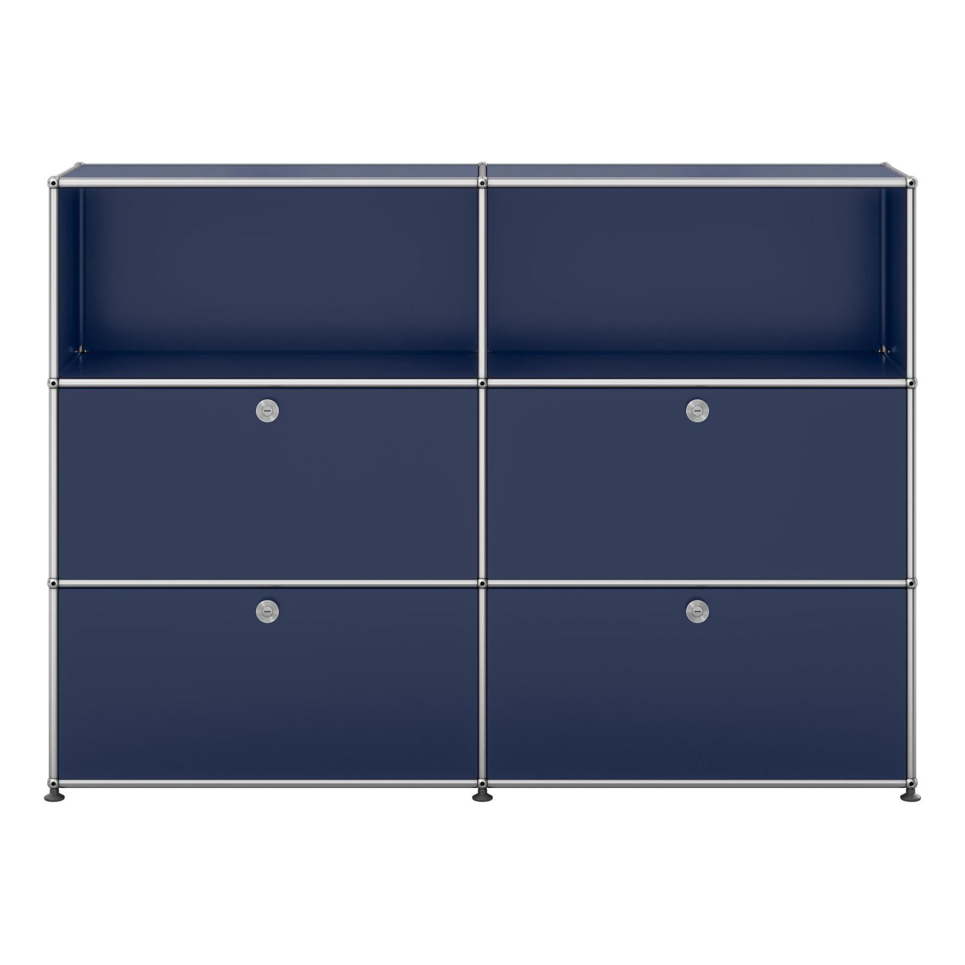 Das modulare Möbelbausystem USM Haller steht seit über 40 Jahren für maßgeschneiderte Lösungen. Aus wenigen Elementen entstehen Möbel für den Wohnbereich, komplette Arbeitsplätze für zu Hause und funktionale Bürolandschaften. In diesem Fall eine Kommode mit vier Klapptüren.