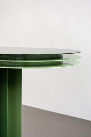 Platte und Fuß bilden formal ein seitlich erkennbares T-Profil, die Frontalansicht hingegen bringt die weichen Figuren von Oval, Kreis und abgerundetem Quadrat zusammen. Charakterisiert wird My Ami aber vor allem durch seine klaren Farben. Zwei Varianten im harmonischen Dreiklang stehen zur Wahl: Multi in gelb, rosa und blutorange sowie Grün in dunkelgrün, reseda und lindgrün.