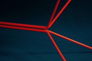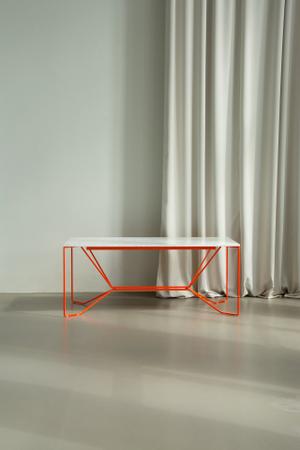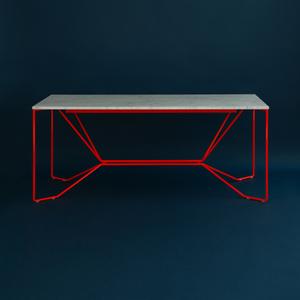 Wenn das filgrane Gestell des Same Same Tisches eine Steinplatte trägt, kann der Kontrast nicht stärker sein. Die Platte wird auf dem Gestell verschraubt und durch einen Stahlrahmen verstärkt.