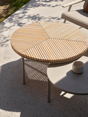 Durch die gekonnte Kombination von Aluminium und Teakholzlamellen verkörpert der Vipp716 Open-Air Couchtisch nicht nur Robustheit und Eleganz, sondern auch ein zeitloses Design, das jeden Loungebereich im Garten, auf der Terrasse oder Balkon aufwertet.