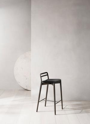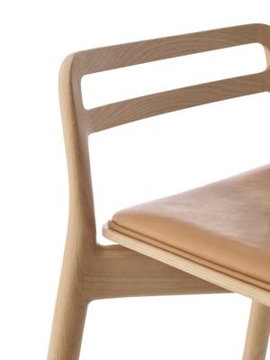 Die gepolsterte Sitzfläche mit dezent geschwungener Rückenlehne bietet angenehmen Halt, ohne wuchtig zu wirken. Der Bezug ist in zwei eleganten Lederfarben erhältlich und verleiht dem Stuhl eine edle, zugleich zurückhaltende Ausstrahlung. Das Gestell aus massivem Holz sorgt für Wärme und Stabilität, während die Fußstrebe aus Edelstahl einen feinen, funktionalen Kontrast setzt.