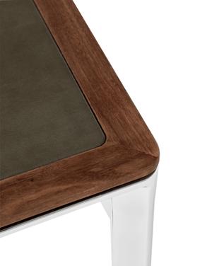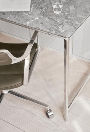 Sein Gestell aus poliertem Aluminium verleiht dem Tisch Stabilität und eine zeitgemäße Optik. Die Tischplatte ist in zwei edlen Varianten erhältlich: Marmor, das natürliche Eleganz ausstrahlt, oder Leder, das mit seiner weichen Haptik und warmen Anmutung überzeugt. Beide Materialien unterstreichen die Liebe zum Detail und die Sorgfalt, die in die Fertigung dieses Möbels eingeflossen sind.