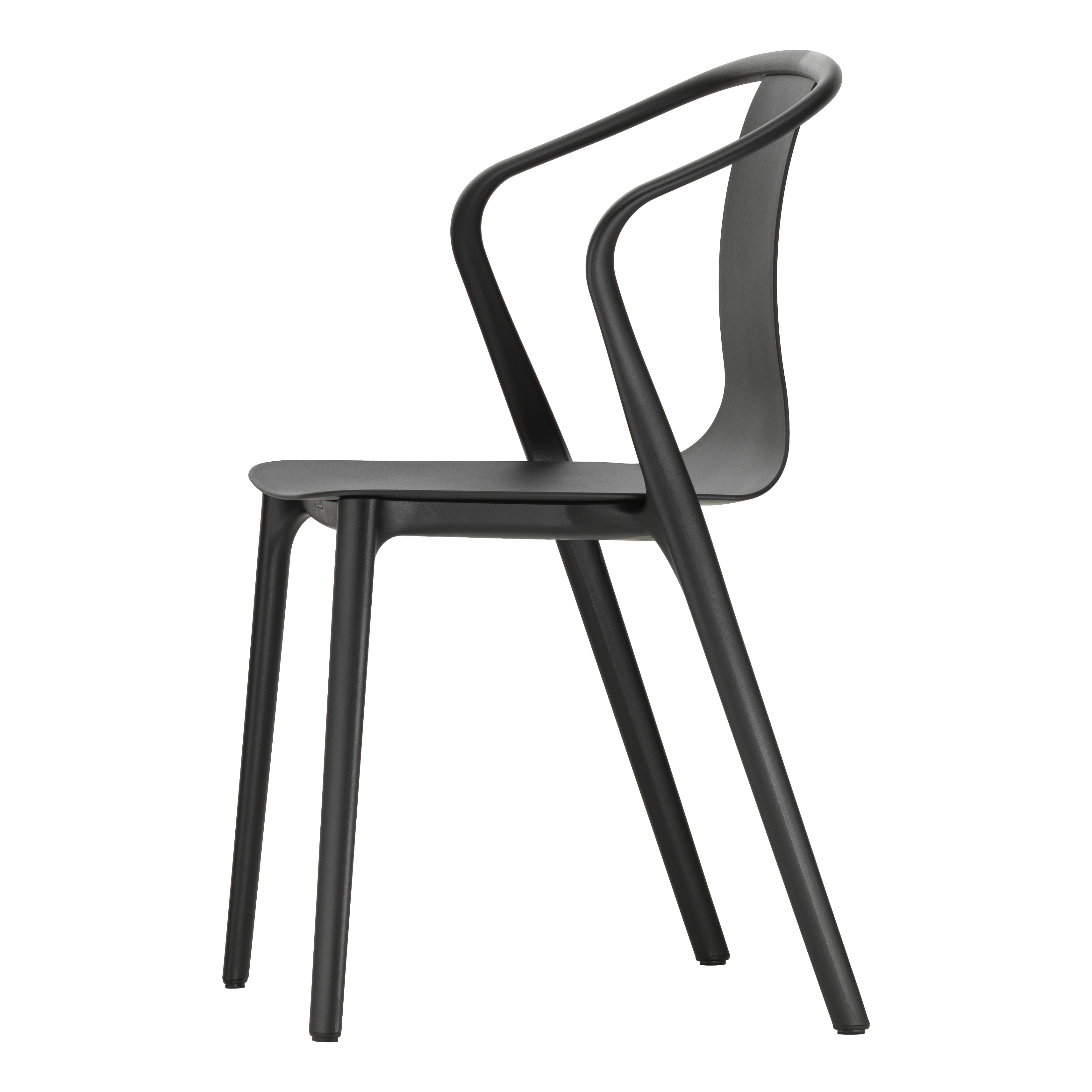 Der Belleville Chair ist ein technisch raffiniert aufgebauter Kunststoffstuhl aus zwei Komponenten – einer Rahmenstruktur und einer Sitzschale. Ein schlanker schwarzer Rahmen zeichnet, einer Kalligraphie gleich, Beine und Rückenlehne des Stuhls und nimmt eine dünne Schale auf, die sich von einem breiten Sitz zu einer schmalen Rückenlehne verjüngt. Diese Konstruktionsweise eröffnet neue Perspektiven auf die Materialität des Kunststoffstuhls, prägt doch die Fläche der Sitzschale die Identität des Belleville Chair: Weil sie in farbigem Kunststoff, furniertem Formsperrholz oder in Leder bzw. Stoff gepolstert erhältlich ist, wandelt sich die Wahrnehmung des Belleville Chair vom Kunststoffstuhl zum Holzstuhl oder gepolsterten Stuhl – auch als Armchair mit nach vorne geneigten Armlehnen.