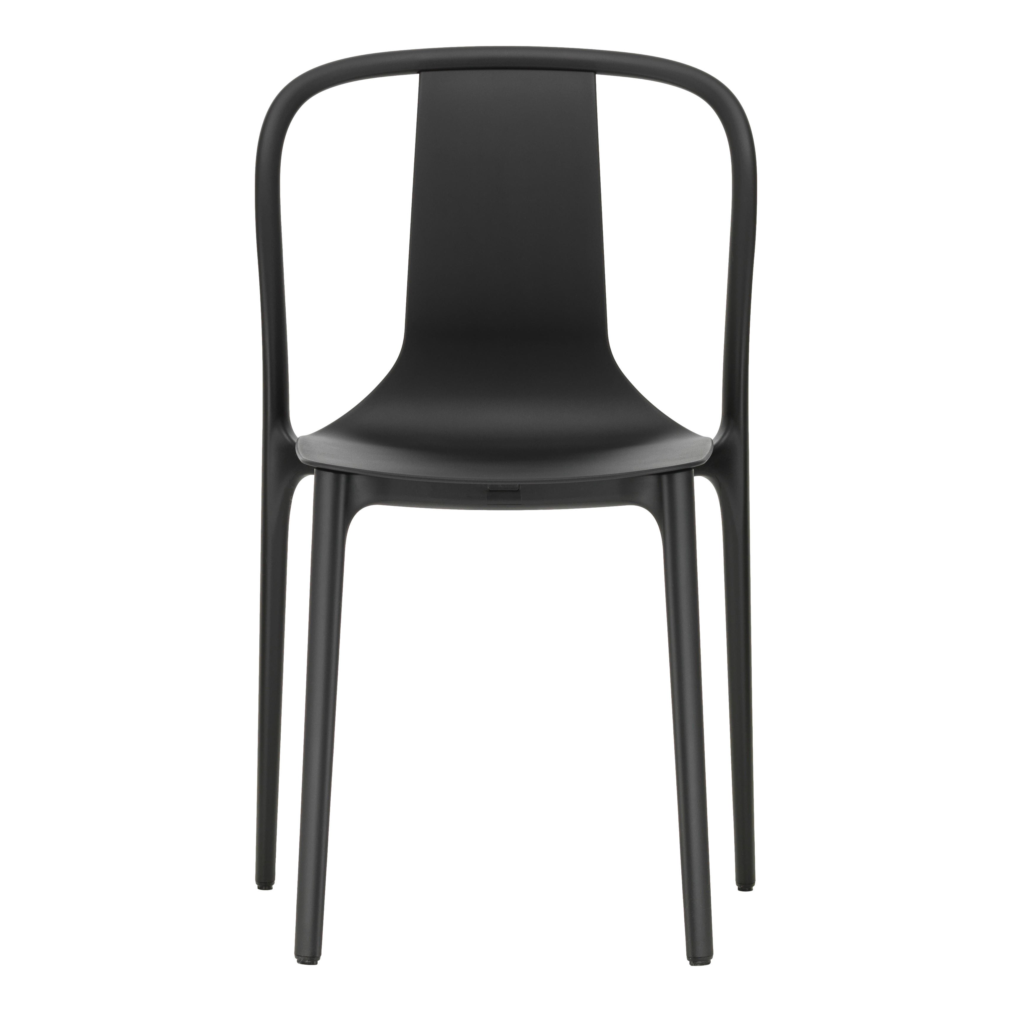 Der Belleville Chair ist ein technisch raffiniert aufgebauter Kunststoffstuhl aus zwei Komponenten – einer Rahmenstruktur und einer Sitzschale. Ein schlanker schwarzer Rahmen zeichnet, einer Kalligraphie gleich, Beine und Rückenlehne des Stuhls und nimmt eine dünne Schale auf, die sich von einem breiten Sitz zu einer schmalen Rückenlehne verjüngt. Diese Konstruktionsweise eröffnet neue Perspektiven auf die Materialität des Kunststoffstuhls, prägt doch die Fläche der Sitzschale die Identität des Belleville Chair: Weil sie in farbigem Kunststoff, furniertem Formsperrholz oder in Leder bzw. Stoff gepolstert erhältlich ist, wandelt sich die Wahrnehmung des Belleville Chair vom Kunststoffstuhl zum Holzstuhl oder gepolsterten Stuhl – auch als Armchair mit nach vorne geneigten Armlehnen.