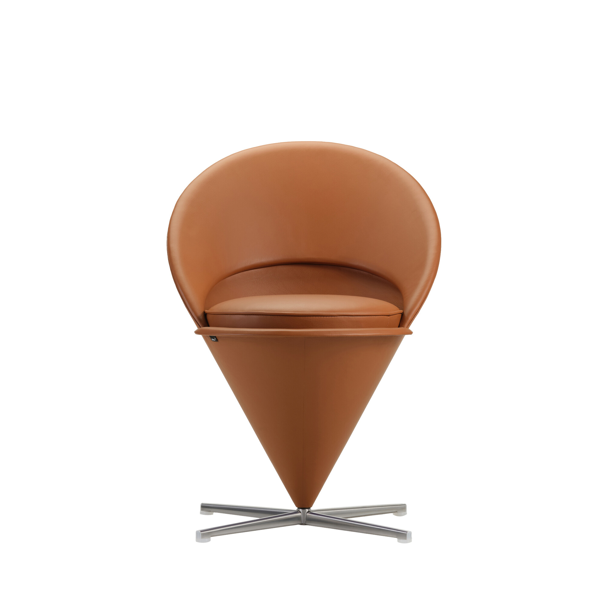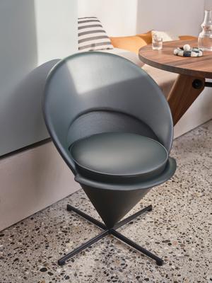 Der Cone Chair entstand 1958 und zählt zu den prägenden Sitzmöbeln der Designgeschichte. Die reduzierte Kegelform verleiht dem Sessel eine klare, grafische Präsenz. Sitzschale und Rückenlehne bilden eine geschlossene Einheit, die Halt gibt und zugleich eine entspannte Sitzhaltung ermöglicht. Der drehbare Sockel unterstützt Beweglichkeit und eine flexible Nutzung.