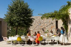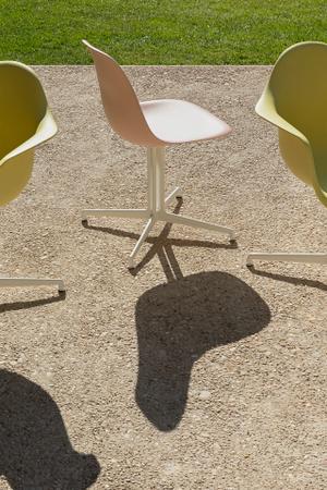 Die Oberflächen der Sitzschalen in verschiedenen Farben weisen wegen der Zusammensetzung des Recyclingwerkstoffs kleinste Sprenkel auf.