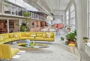 Das Bürositzsystem Soft Work von Vitra kombiniert Elemente aus den Bereichen Wohnen, Büro und öffentliche Räume. Anstatt die Arbeit an festen Bürotischen zu organisieren, steht bei Soft Work eine zentrale Sitzlandschaft im Mittelpunkt. Um diese herum lassen sich Tische und Arbeitsplätze flexibel anordnen.