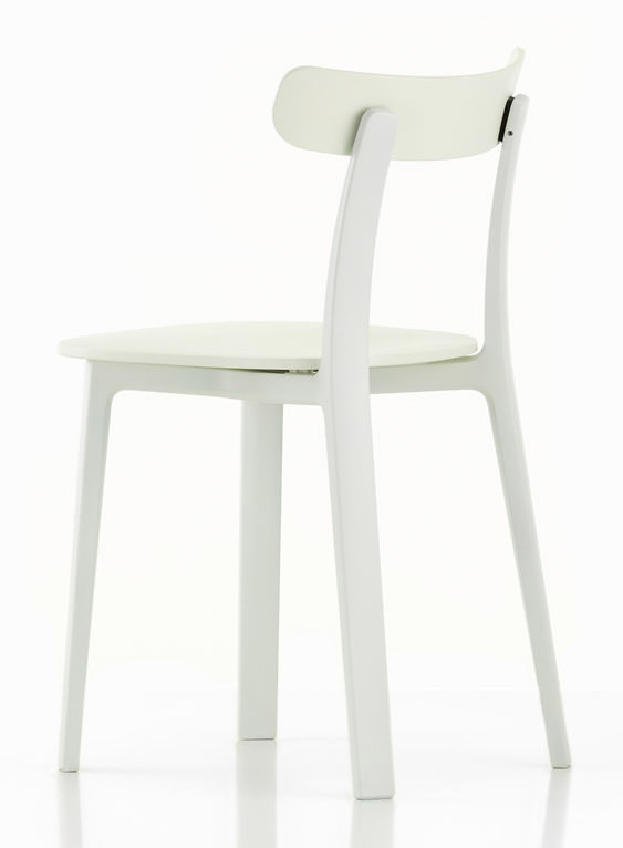 Der flache Rahmen des Vollkunststoffstuhls ist aus einem Guss, die dünne Sitzfläche organisch ausgeformt und die Rückenlehne deutlich feiner gezeichnet als bei Holzstühlen üblich. So ist der All Plastic Chair zwar auffallend kompakt und grazil, bietet aber dank der Kombination unterschiedlicher Kunststoffqualitäten gleichzeitig einen hervorragenden Komfort.