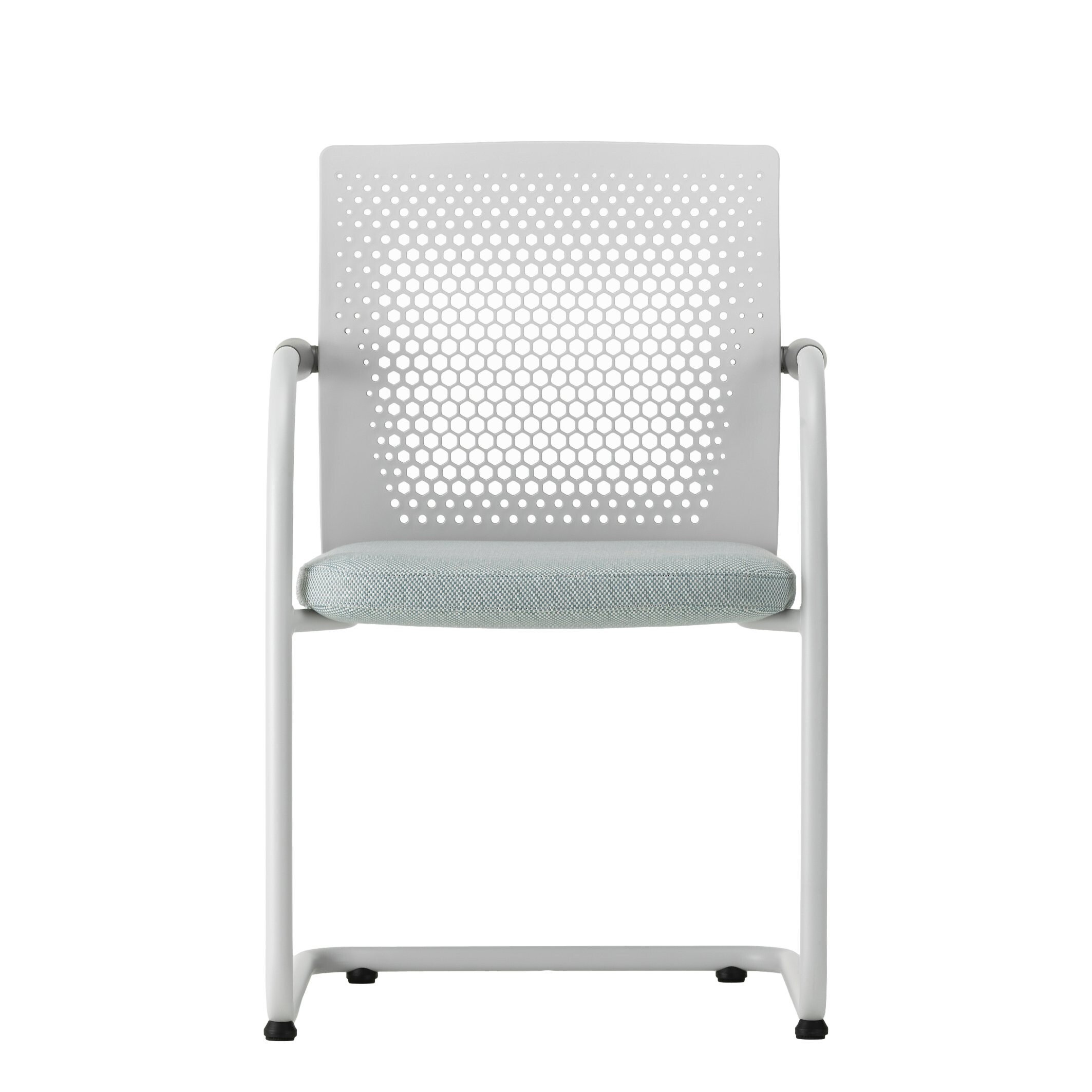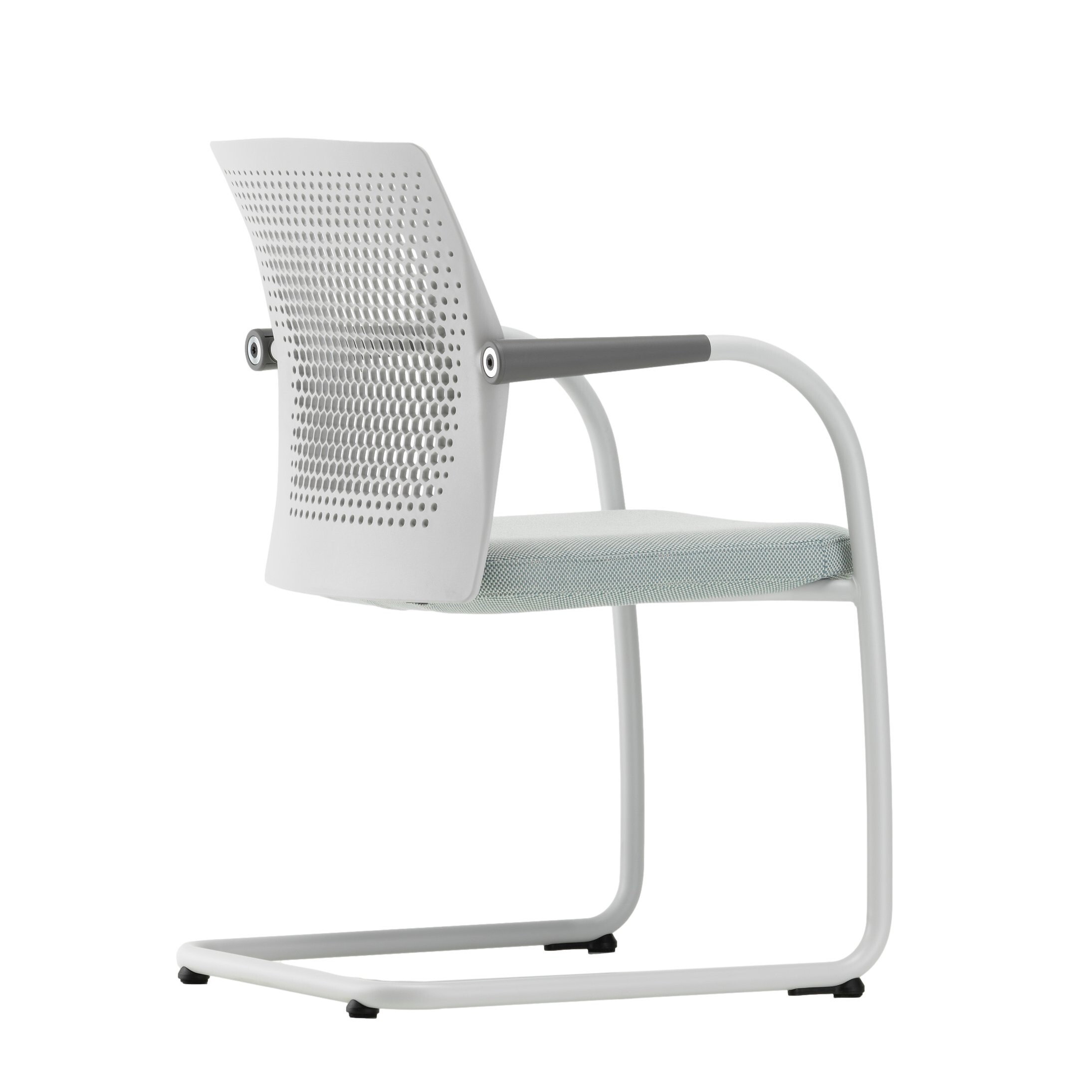 Die Konstruktion als Freischwinger ermöglicht eine angenehme, leicht federnde Bewegung. Das unterstützt den Sitzkomfort auch bei längeren Meetings und sorgt für eine aktive Sitzhaltung ohne zusätzliche Mechanik. Sitz und Rücken sind klar proportioniert und bieten zuverlässige Unterstützung im Arbeitsalltag.