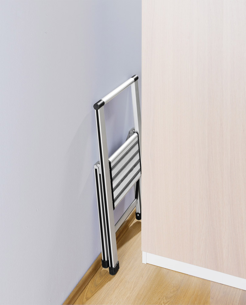 Die Klapptrittleitern tragen eine Last bis 150kg. Bei Nichtgebrauch lässt sich die Leiter ultraflach zusammenklappen und platzsparend verstauen.