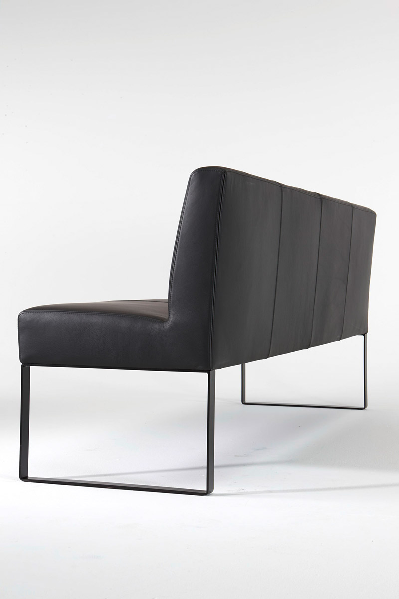 Die Bank Byblos steht auf coolen Metallkufen in U-Form. Ihr Design stammt aus der Feder von Claus P. Seipp und kann mit verschiedenen Stoff- und Ledervariationen nach ihren Vorlieben konfiguriert werden.
