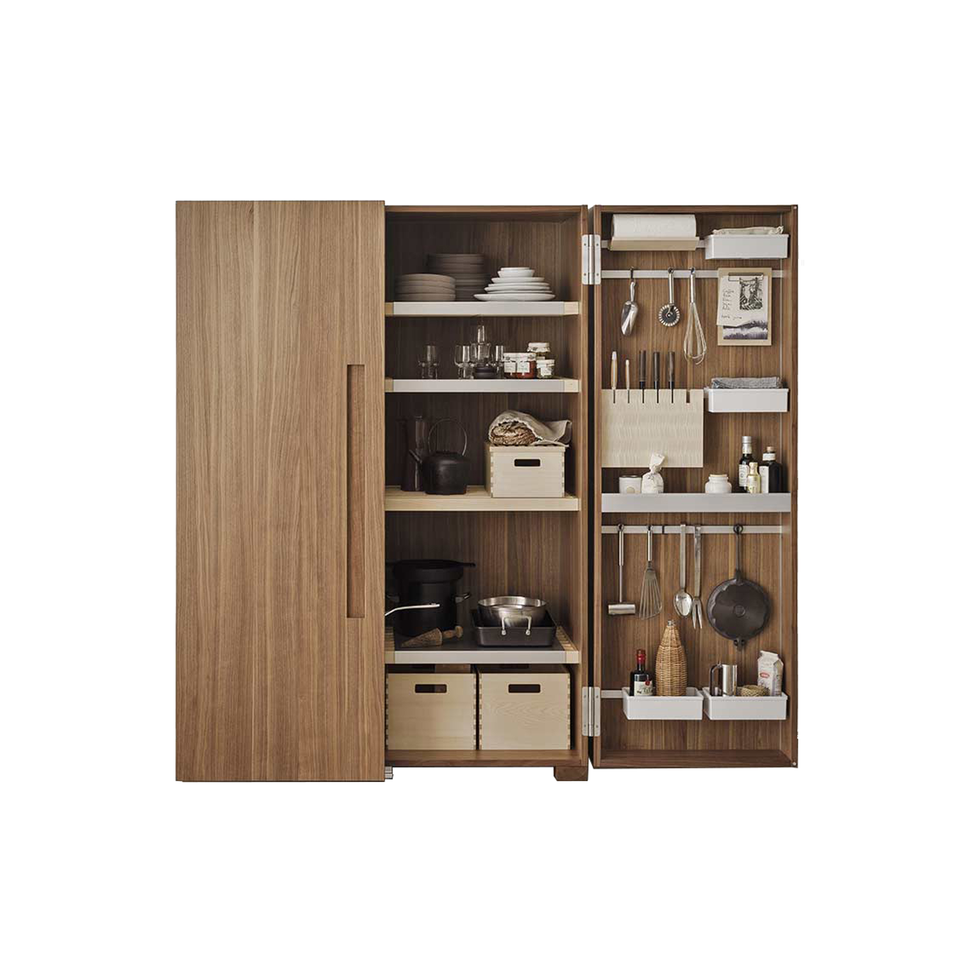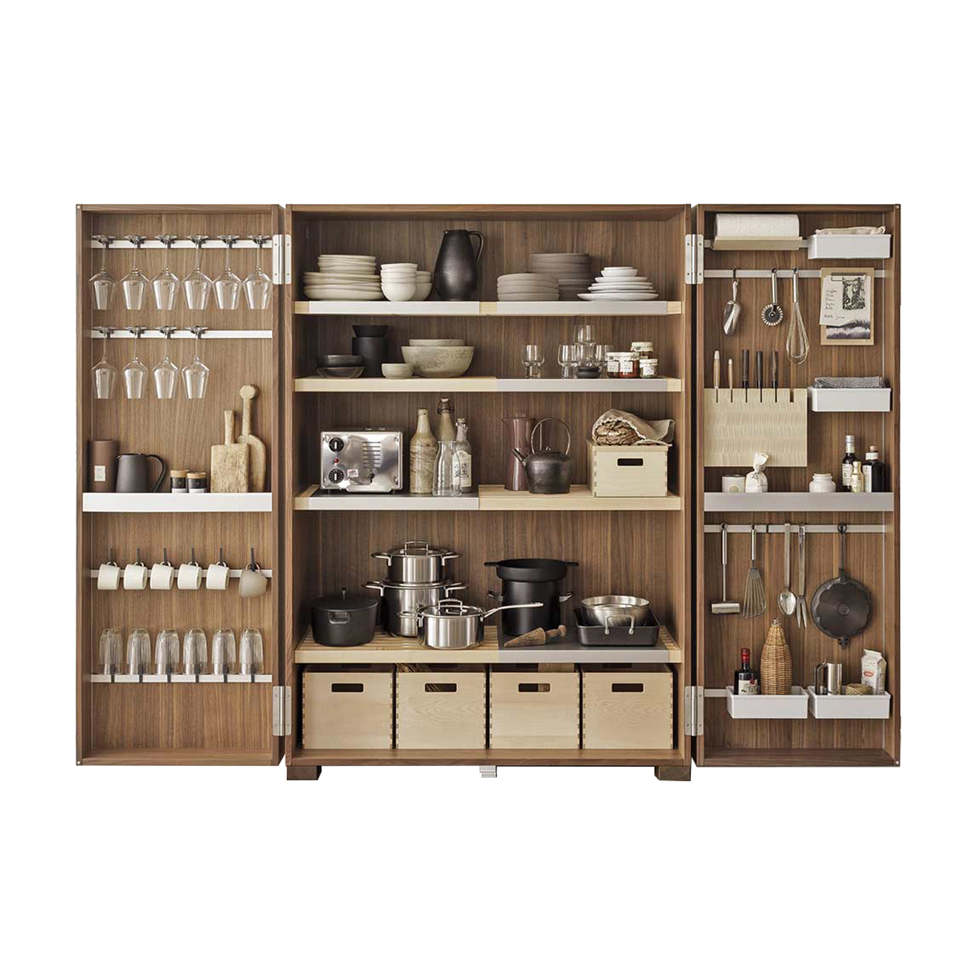 Wie ein Handwerkerschrank für Werkzeuge, bietet auch der bulthaup b2 Küchenwerkschrank den perfekten Platz für Ihre Küchenutensilien. Die tiefen Koffertüren ermöglichen die Aufbewahrung von Gläsern und weiteren Utensilien, wodurch jeder Gegenstand seinen festen Platz hat.