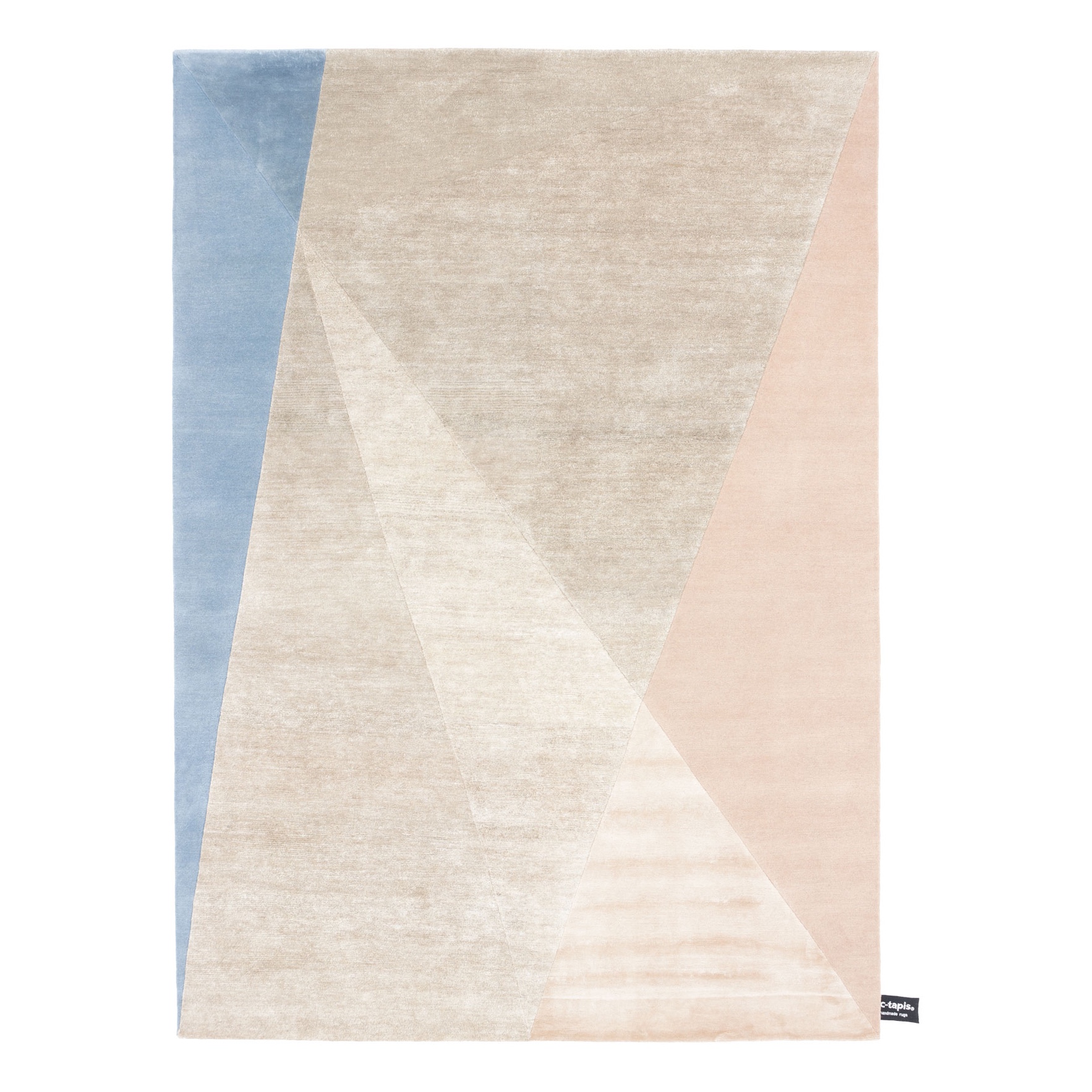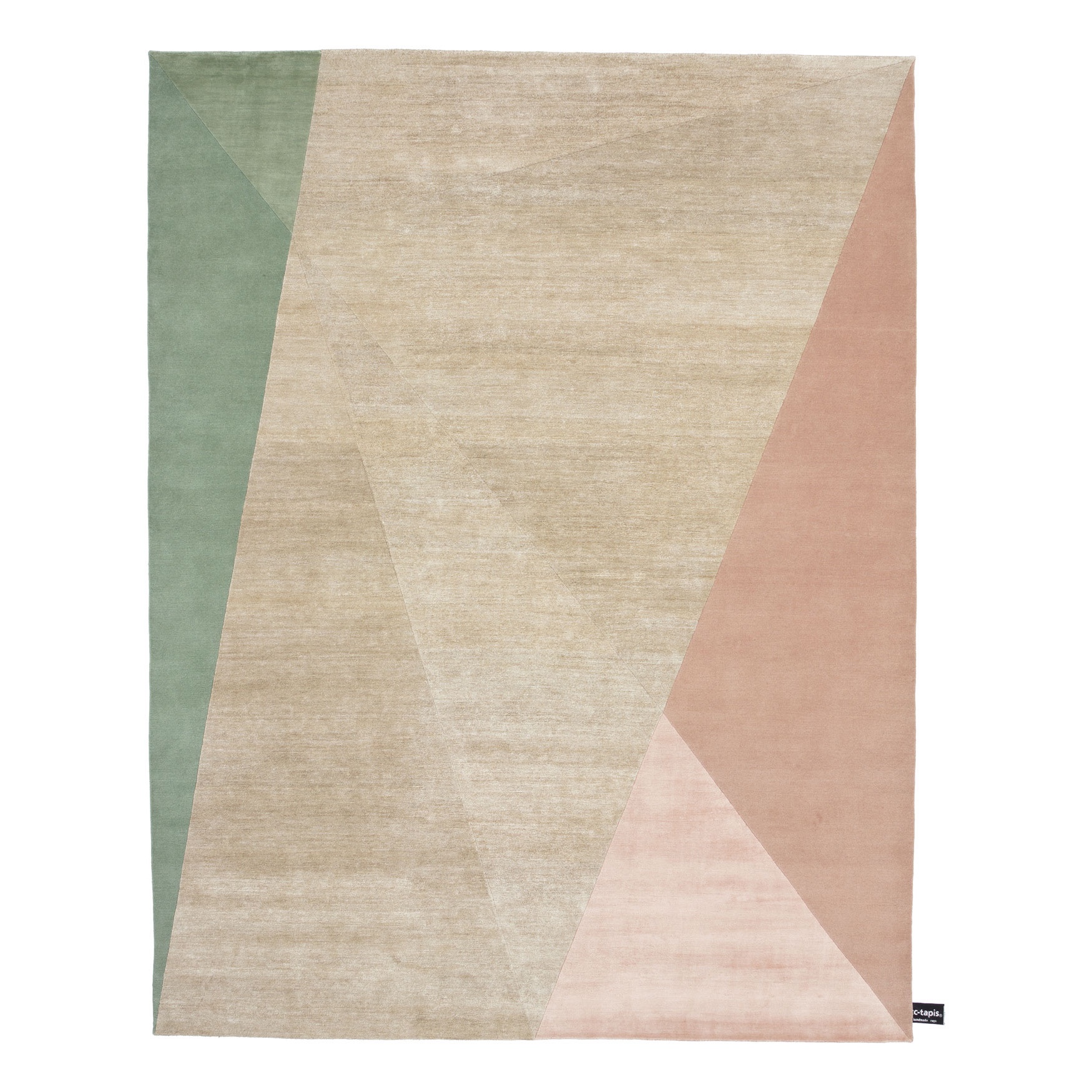 Der in Nepal handgefertigte Teppich Dipped Angle, hebt sich durch die Zusammenstellung von verschiedenförmigen pastellfarbenen Dreiecken hervor.