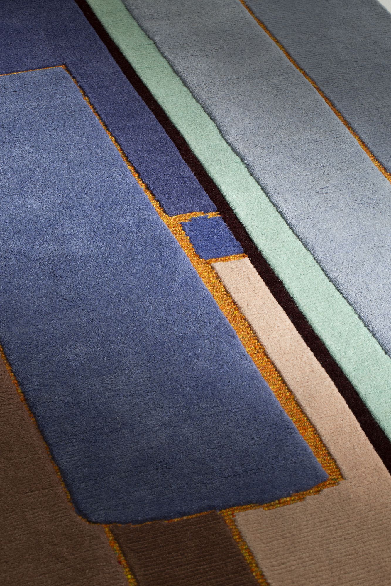 In jedem Teppich der Patcha-Kollektion treffen eine Vielzahl von Texturen, Florhöhen und Farben aufeinander, wobei nachhaltige Färbetechniken, die weniger Wasser verbrauchen, und neuartige Materialien wie Seidenreste aus der indischen Sari-Produktion zum Einsatz kommen. Durch die Überlappung verschiedener Wollfragemente erinnert der Teppich an zerknitterte Papiere und bunte Kartons, die zu einer improvisierten Collage zusammengesetzt sind.