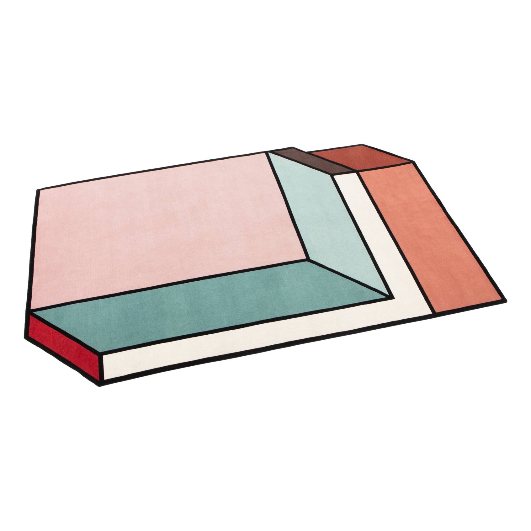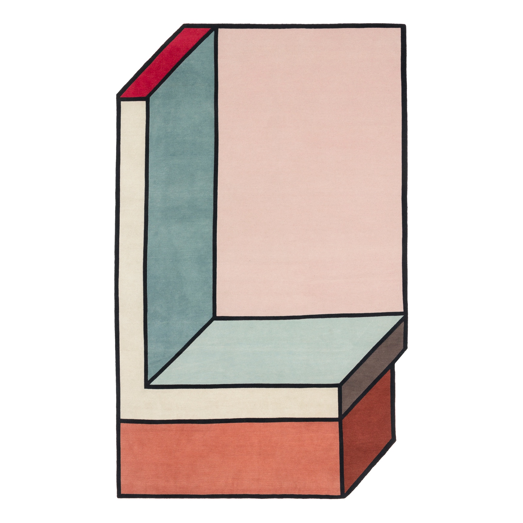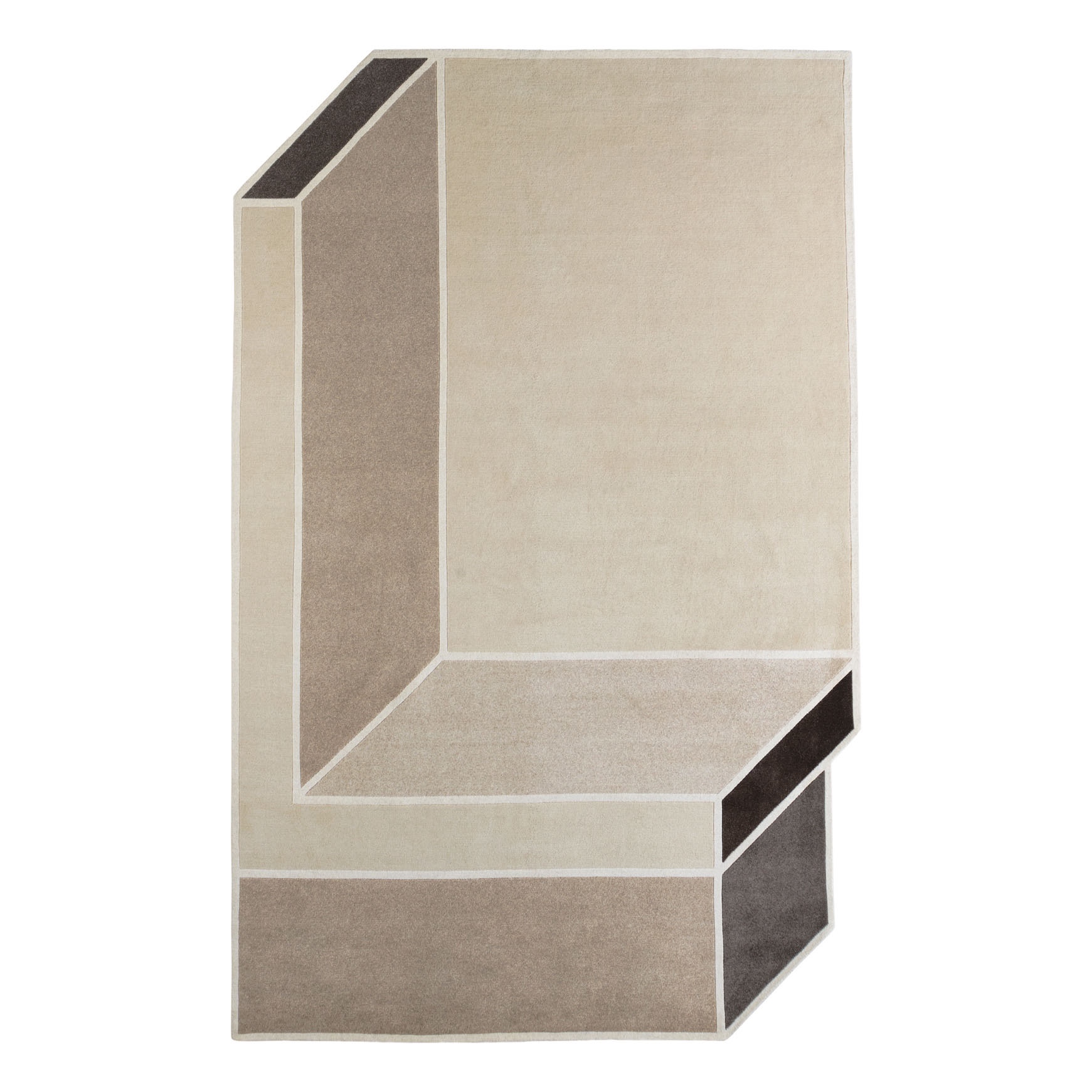 Durch den asymmetrischen Schnitt und den linear angeordneten Felder, wirkt der Teppich raumdefinierend und visuell sehr modern.