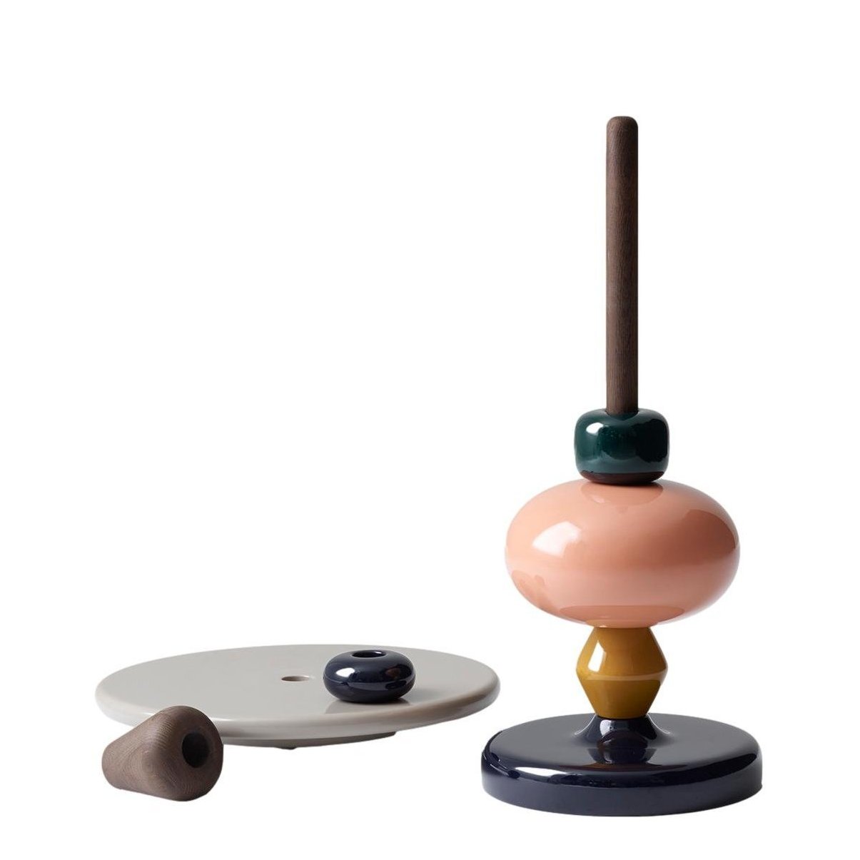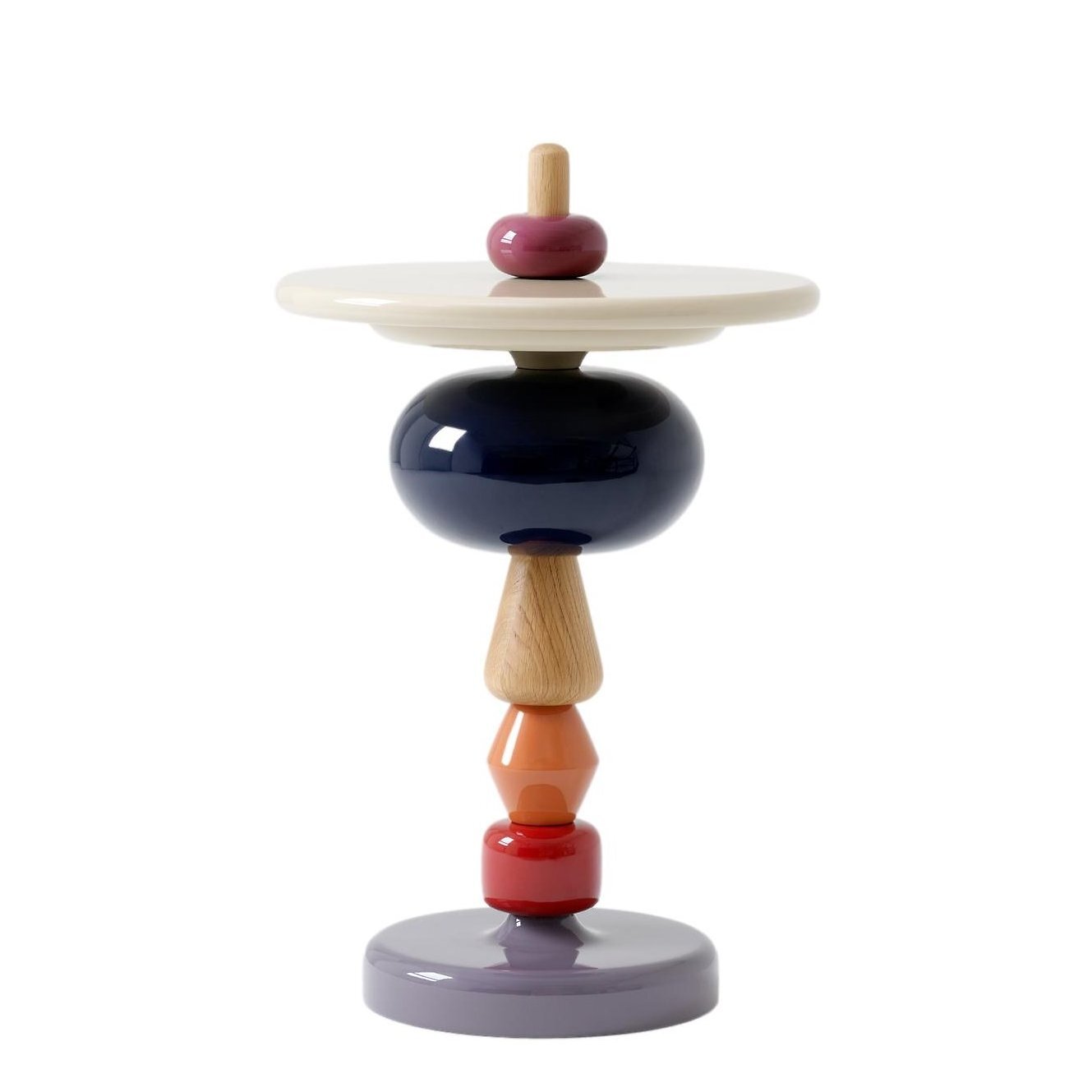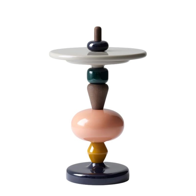 Shuffle erinnert an traditionelle Drechselarbeiten, stellt die alten Entwürfe aber gleichzeitig auf den Kopf. Die Elemente können schnell neu zusammengestellt werden. So variiert der Tisch in Höhe und Farbe.