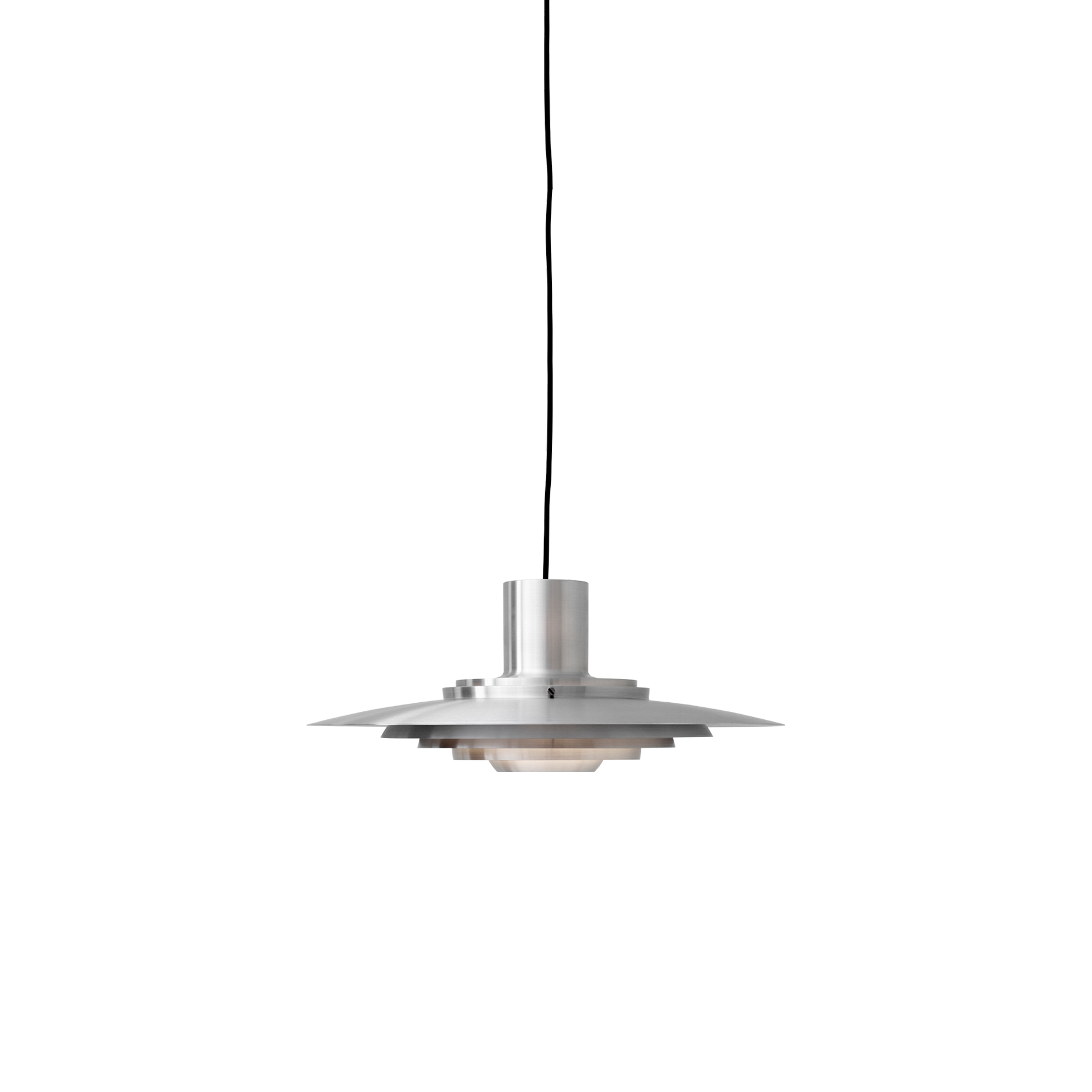 Fünf konzentrische, sanft gekrümmte Scheiben erzeugen ein weiches, diffuses Licht. Die Leuchte ist in zwei Größen, in reinem Aluminium oder matt weiß lackiert erhältlich.