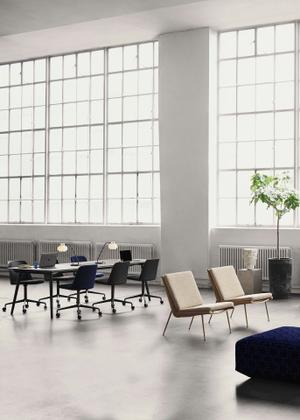 Der schnörkellose Sessel von Hvidt & Mølgaard wurde erstmals 1956 vorgestellt. Mit dem handpolierten Holzrahmen und den schlanken Messingbeinen ist der Boomerang Sessel ein Meisterwerk des dänischen Designs.